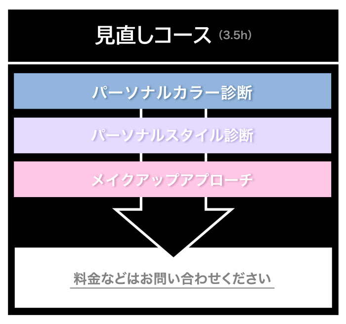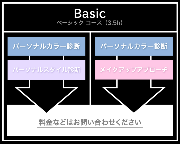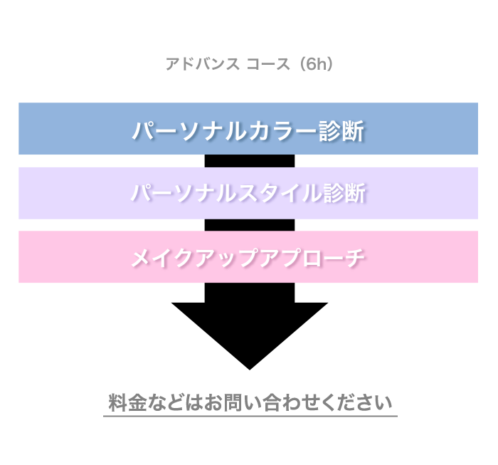Basic(ベーシックコース)では【パーソナルカラー診断】をまず受けていただき、【パーソナルスタイル診断】または【メイクアップアプローチ】のどちらかをお選びいただけます。Advance(アドバンスコース)では3つ全ての診断を受けていただきます。単品メニューもご用意しております。お気軽にお問い合わせください