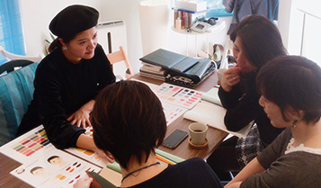 皆さんのお顔や身体の形を見せて頂き、お似合いになる柄やファッションアイテム、アクセサリーの大きさ、髪型などを診断します。またなりたいイメージに向けてもヒアリングさせていただき、イメージに向けてのアドバイスや演出の仕方など、パーソナルカラーを活かしたより深いご提案を致します。